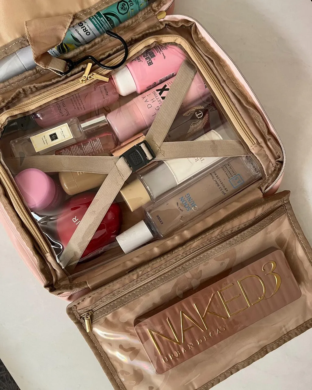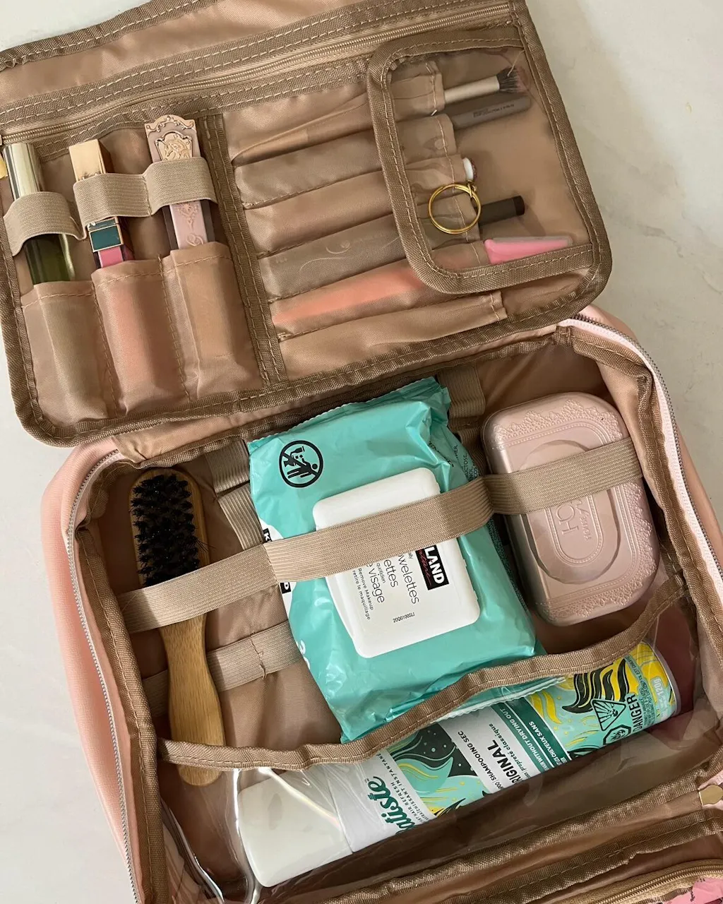 This chic and stylish bag features two large pouches with transparent zippers that make it easy to see what's inside, allowing you to quickly grab the items you need without having to dig through your bag. The transparent pouches are perfect for storing your makeup and beauty tools, making it easy to find your favorite lipstick or brush.