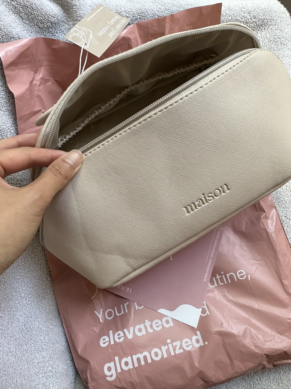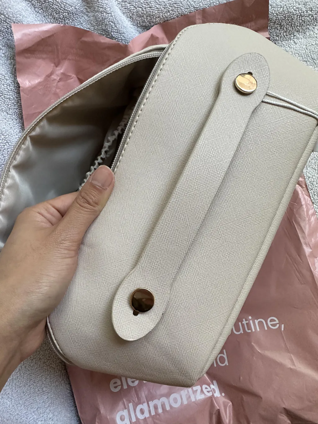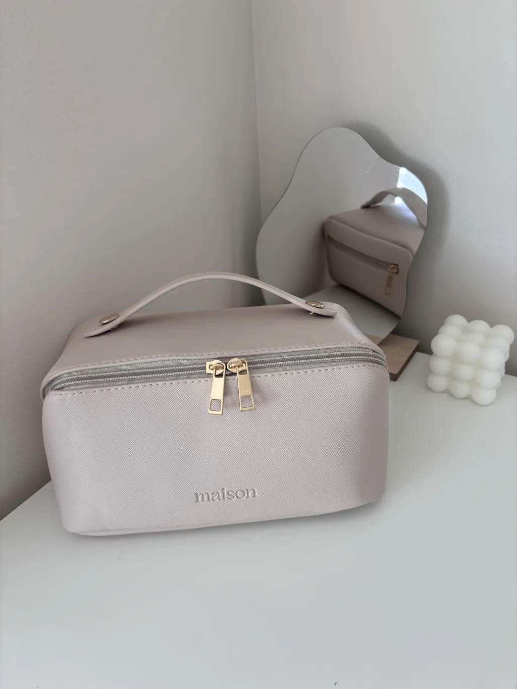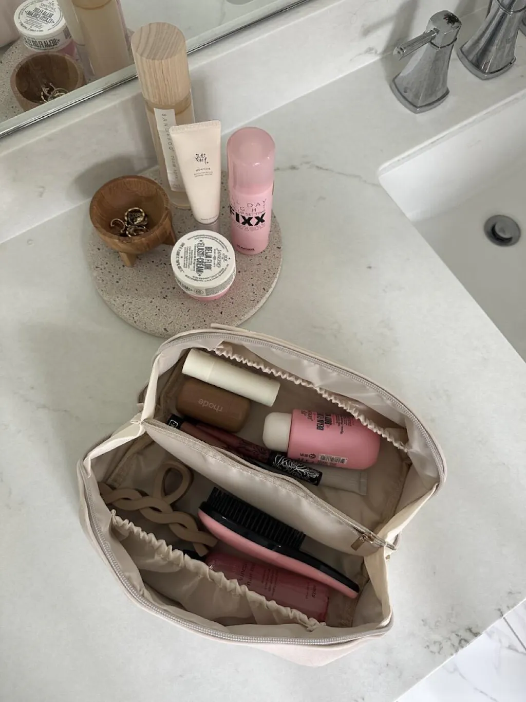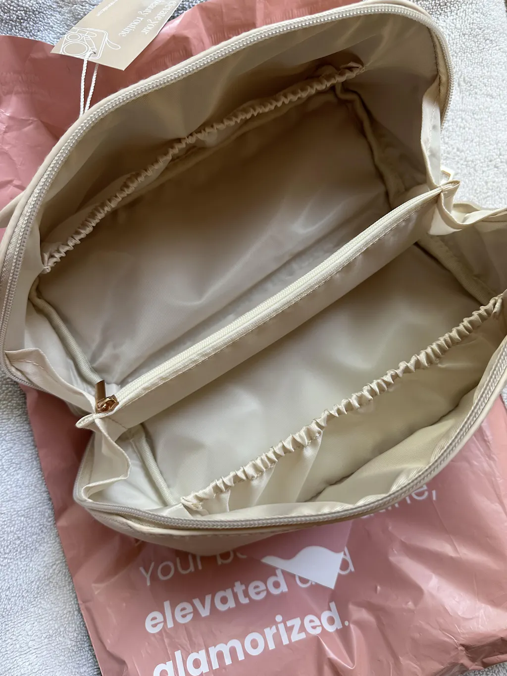 Our unique, expandable design allows you to easily store all of your full-sized skincare products, cosmetics, and jewelry in one convenient location. The bag is made with high-quality materials and is designed to be travel-friendly, making it the ultimate accessory for any jet-setter. With our stylish and functional makeup bag, you'll never have to worry about disorganized beauty essentials again!